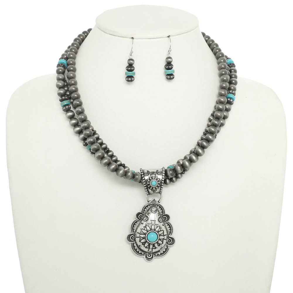MULTISTRAND FLORAL TURQUOISE TEARDROP PENDANT BEADED NECKLACE EARRING SET