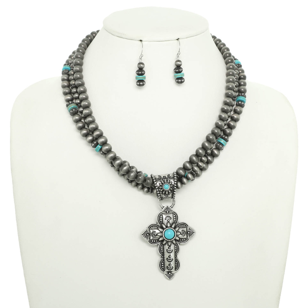 MULTISTRAND NATIVE INSPIRED TURQUOISE CROSS PENDANT BEADED NECKLACE EARRING SET