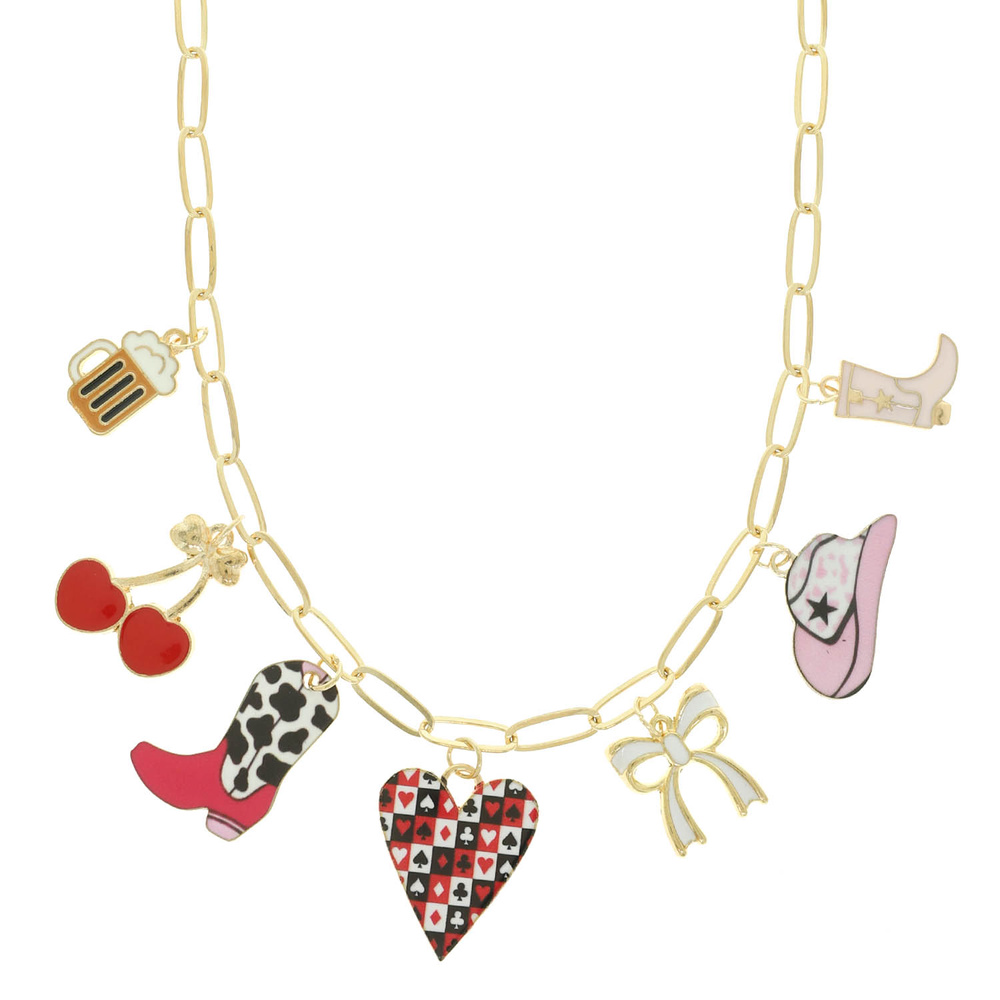 ENAMEL CHARM NECKLACE FEATURES BEER, CHERRY, BOOTS, HEART, BOW, AND HAT TRINKET