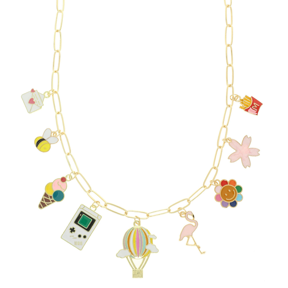 ENAMEL CHARM NECKLACE FEATURES LETTER, BEE, ICE CREAM, HANDHELD, AIR BALLOON, FLAMINGO, FLOWERS, AND FRIES TRINKET