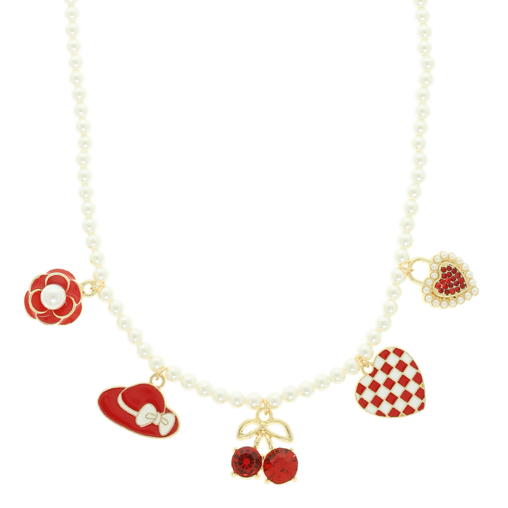 RED AND WHITE ENAMEL CHARM NECKLACE WITH PEARL FLOWER, HAT, CRYSTAL CHERRY, CHECKER HEART, JEWELED HEART TRINKET