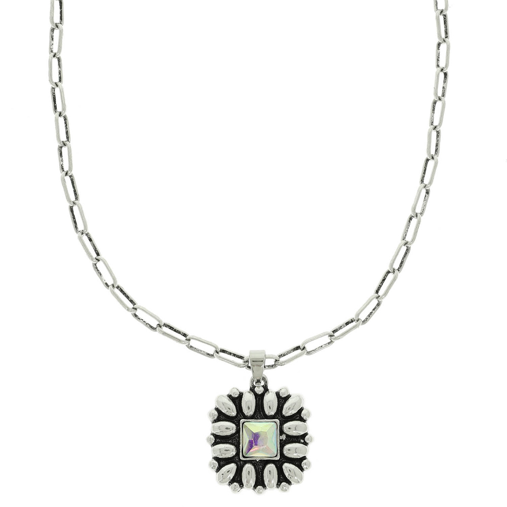 FLORAL SQUARE CONCHO PENDANT NECKLACE WITH CRYSTAL IN OXIDIZED SILVER TONE METAL