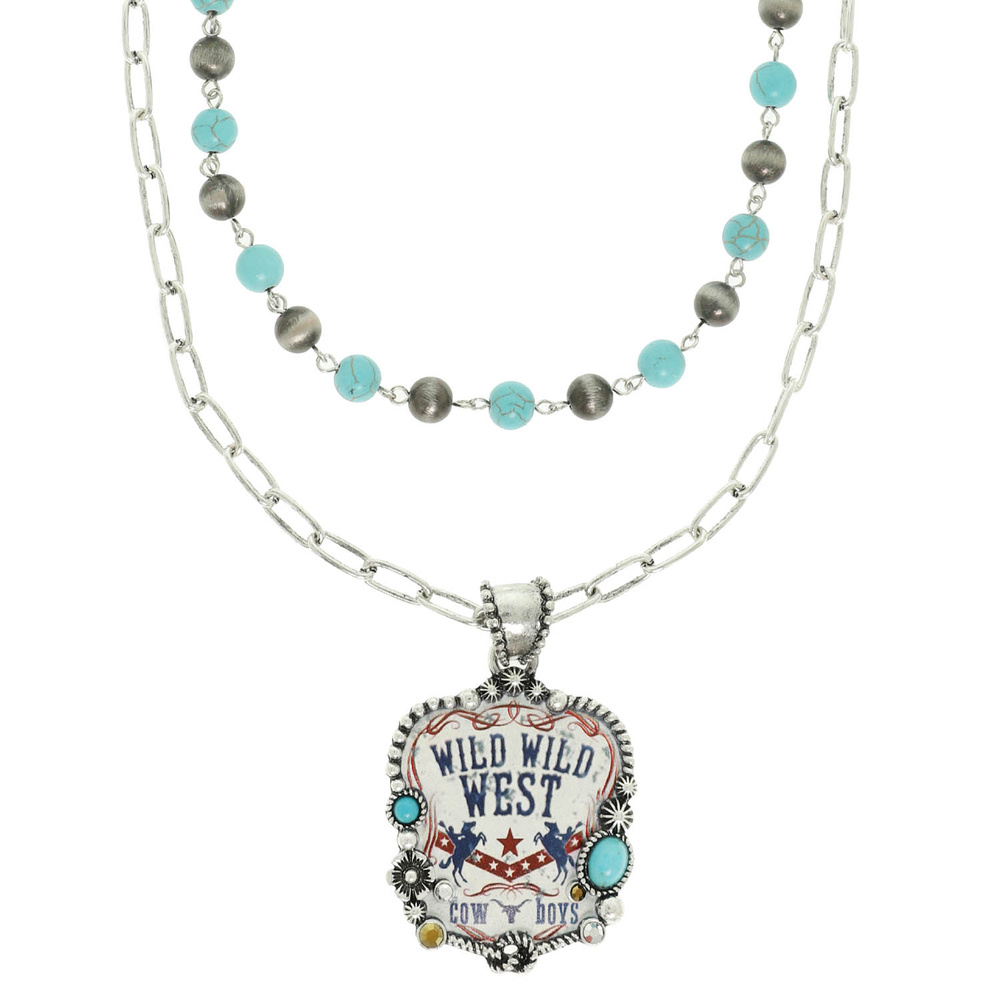 MULTISTAND TURQUOISE CRYSTAL EMBELLISHED TOOLED LEATHER INLAY WILD WEST COWBOY PENDANT NECKLACE