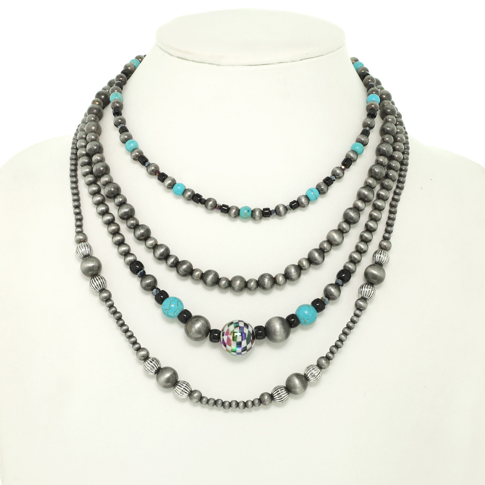 MULTI-STRAND WESTERN MULTI COLORED BEADED NECKLACE WITH CHECKERED FOCAL BALL CHARM