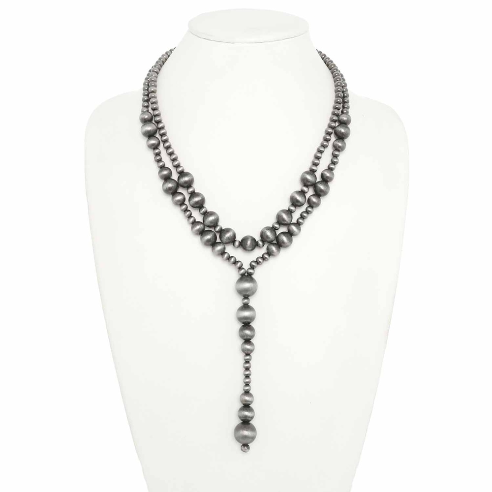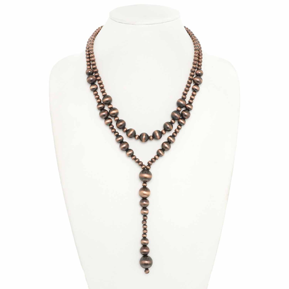 MULTI STRAND BEADED LARIAT NECKLACE IN BURNISHED COPPER AND SILVER TONE FINISHES