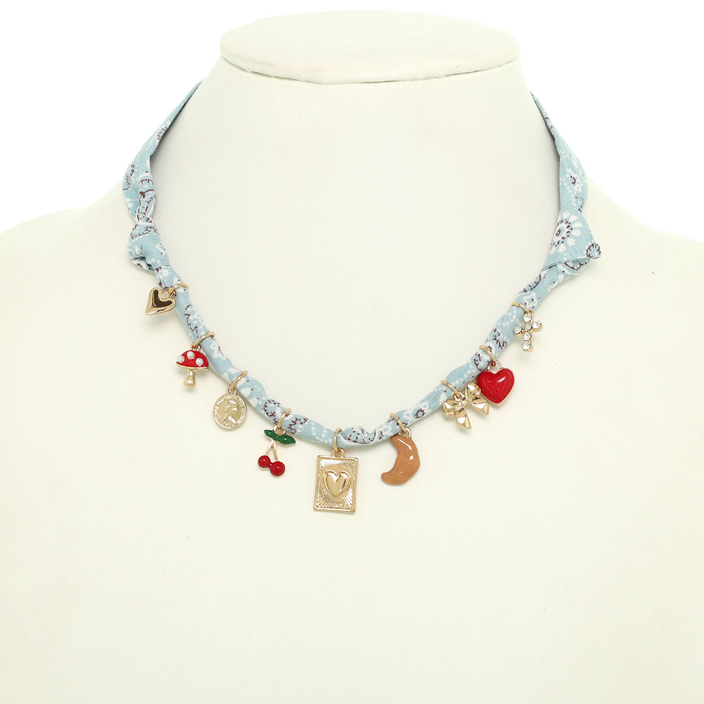 BRAIDED FABRIC CHARM NECKLACE WITH HEART BOW MOON CHERRY COIN MUSHROOM CROSS AND CROISSANT PENDANTS