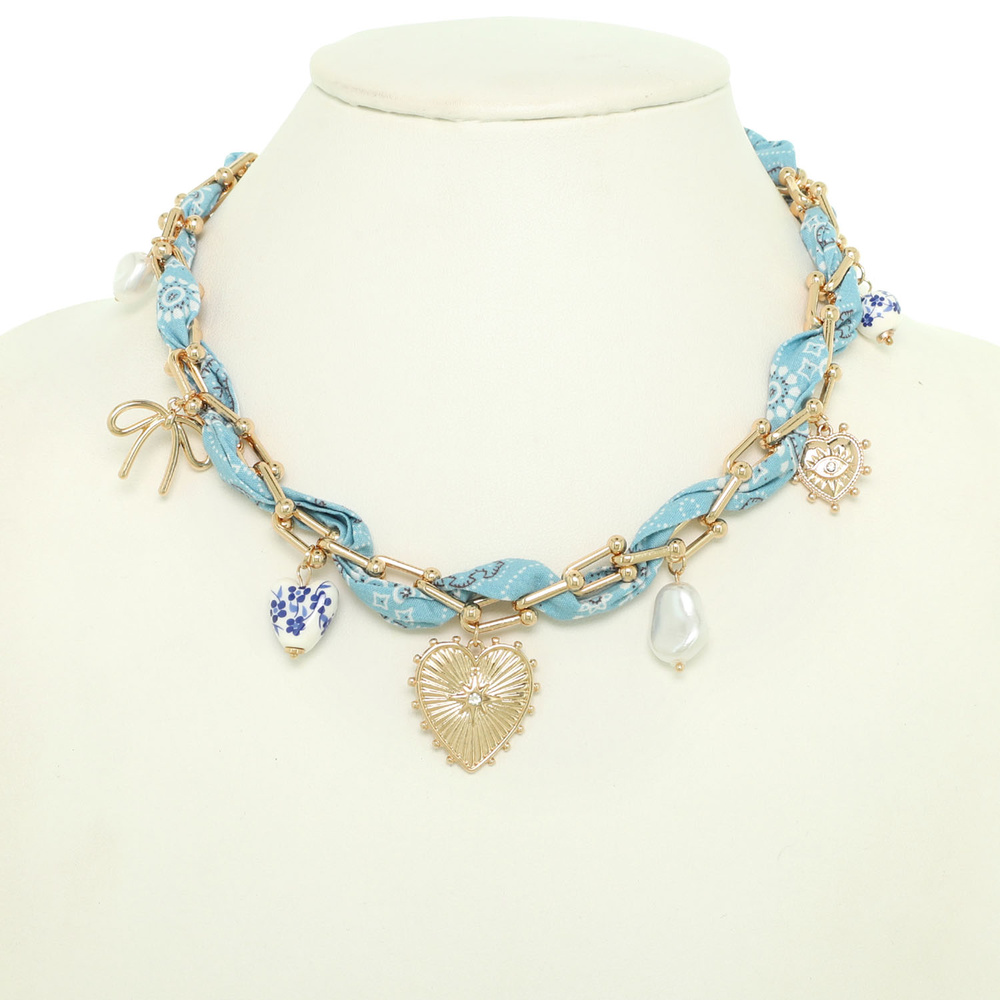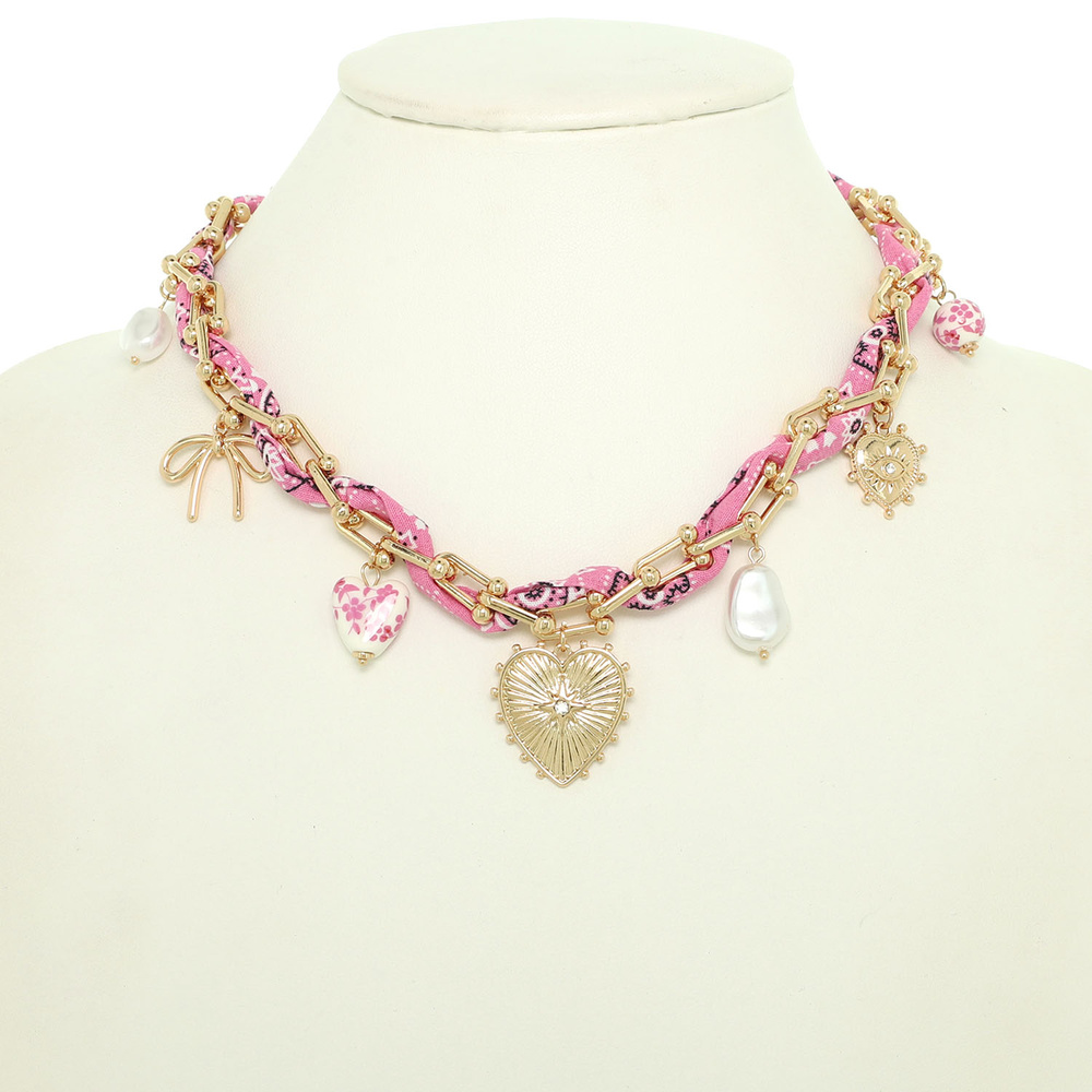 BRAIDED BANDANA NECKLACE WITH LINK CHAIN HEART BAROQUE PEARL AND MIXED CHARMS