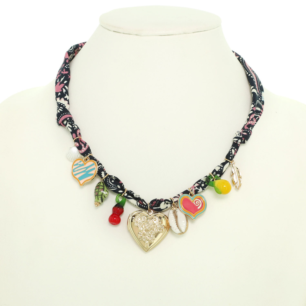 BANDANA FABRIC NECKLACE WITH SHELL FLORAL HEART FISH CHERRIES LEMON AND FEATHER CHARMS