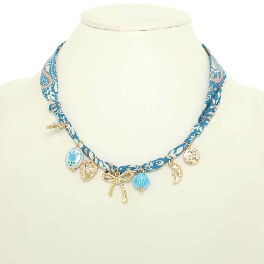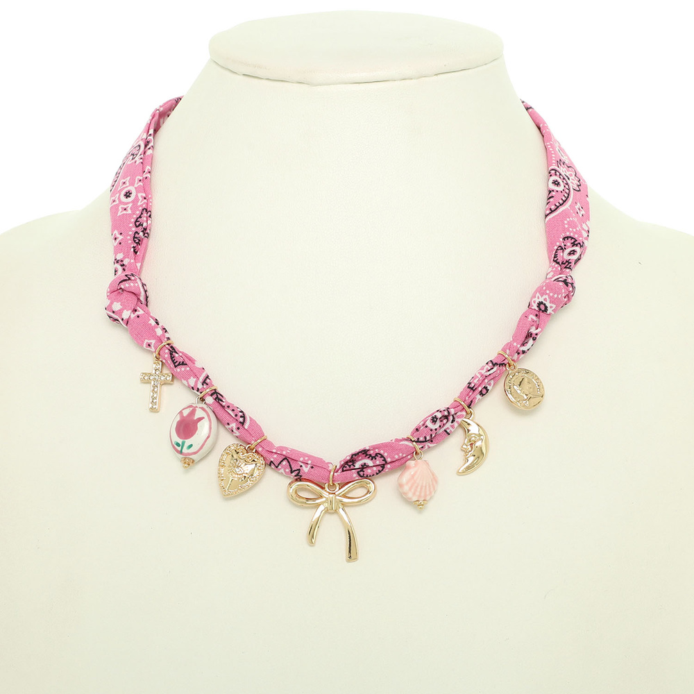 BANDANA FABRIC CHARM NECKLACE WITH HEART CRYSTAL CROSS BOW MOON AND SHELL PENDANTS