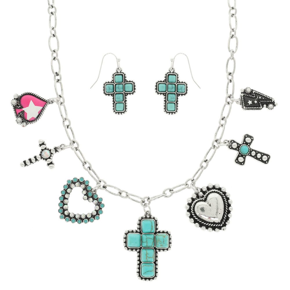 WESTERN TURQUOISE EMBELLISHED CROSS AND HEART THEME MULTI CHARM NECKLACE EARRING SET