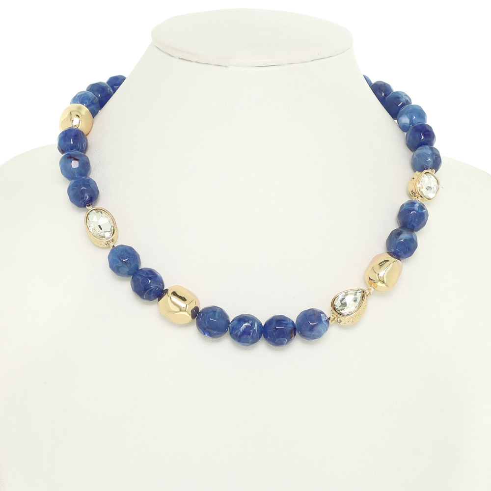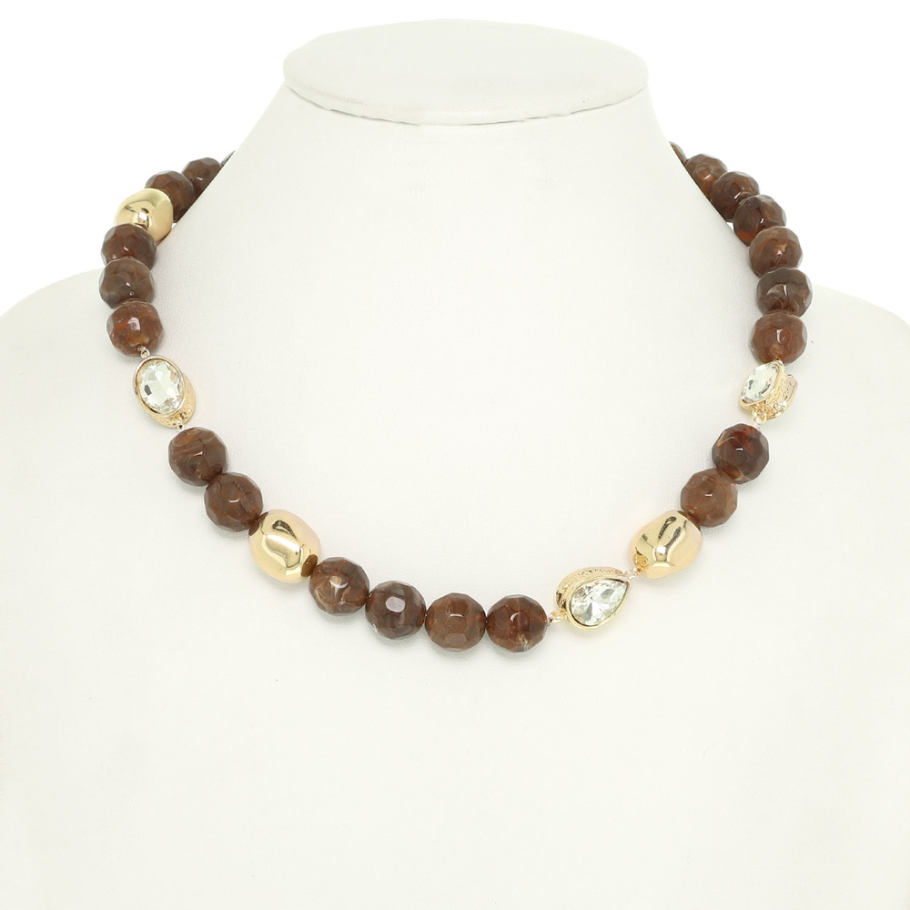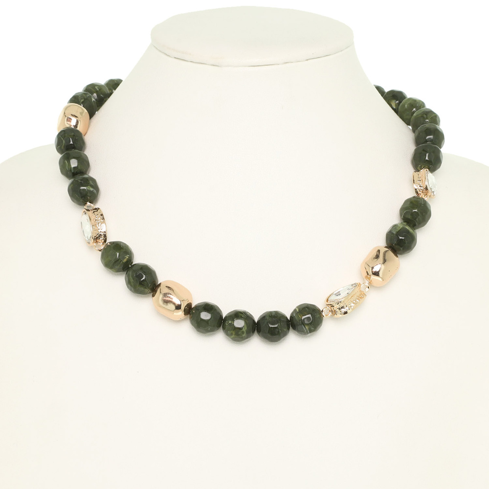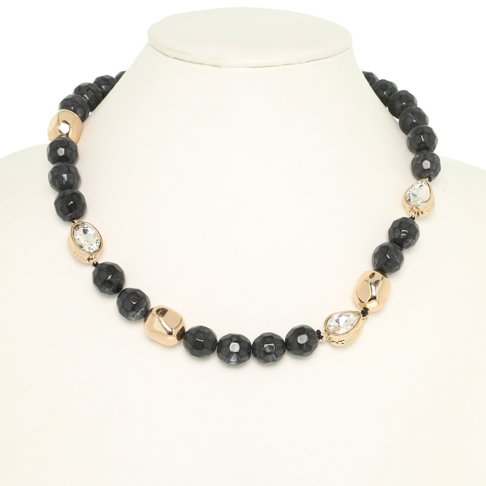 MULTI FACETED BEAD NECKLACE WITH GOLD TONE METAL AND CRYSTAL ACCENTS