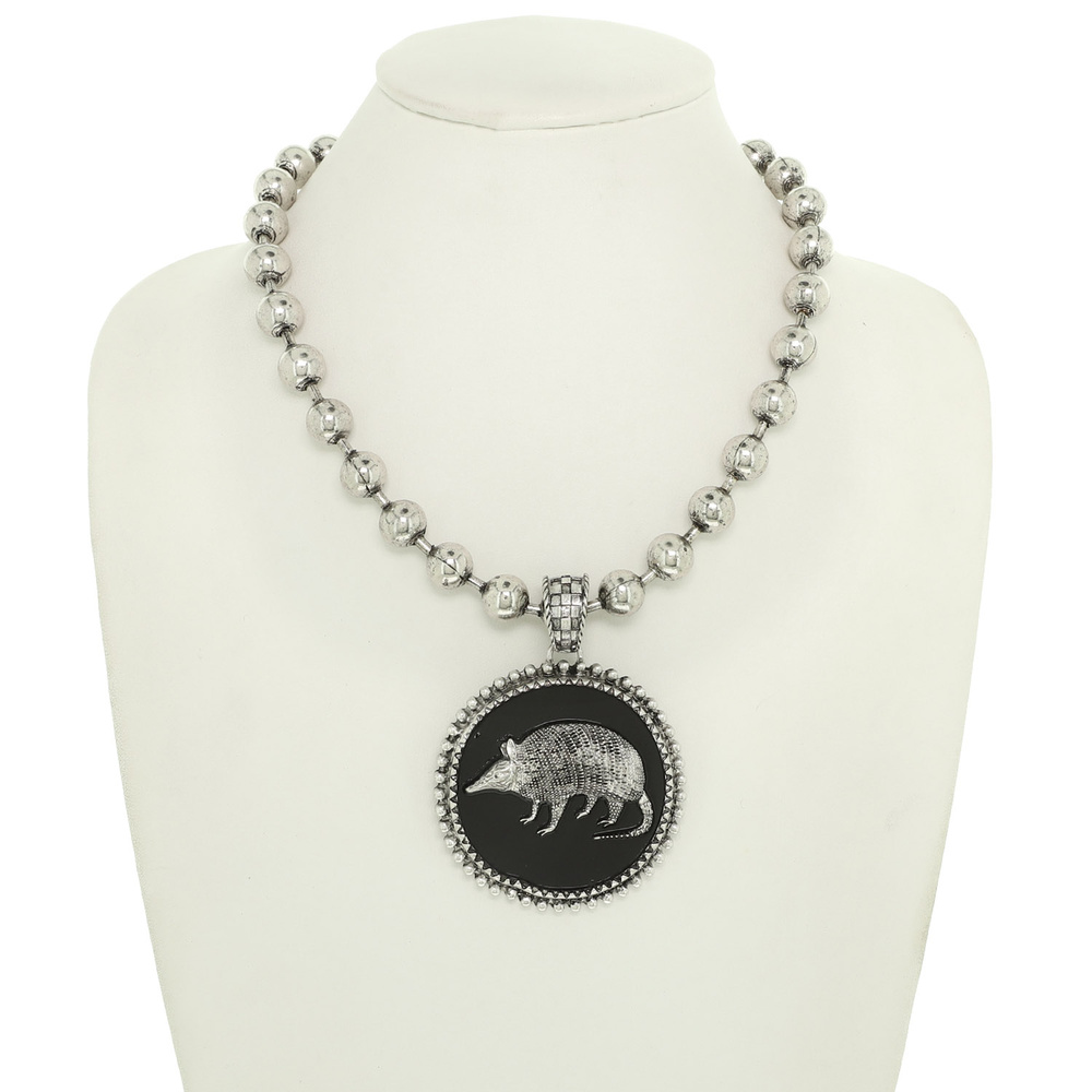 WESTERN BLACK ALMADILLO PENDANT BEADED NECKLACE IN OXIDIZED SILVER TONE METAL