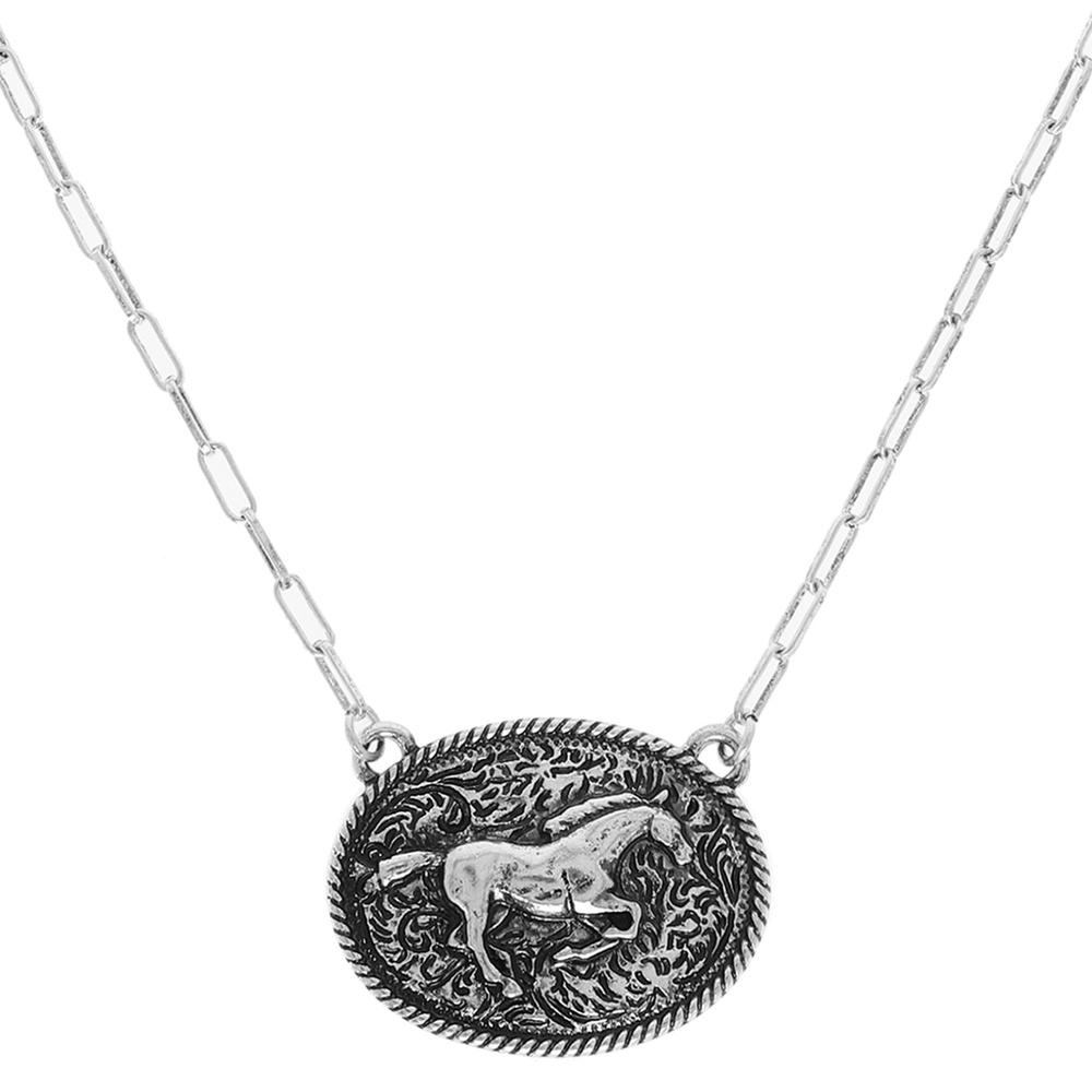 WESTERN RUNNING HORSE COIN PENDANT NECKLACE IN OXIDIZED SILVER TONE METAL