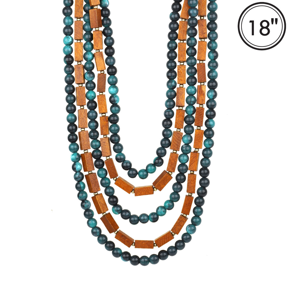 MULTI STRAND WOOD AND TEAL MARBLE STONE BEAD NECKLACE WITH GOLD TONE METAL ACCENTS