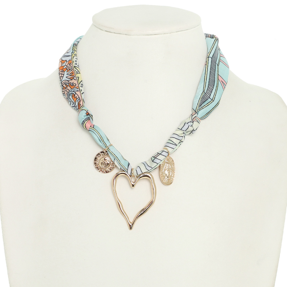 PASTEL ABSTRACT SCARF NECKLACE WITH OPEN HEART PENDANT AND DOUBLE CHARM ACCENTS