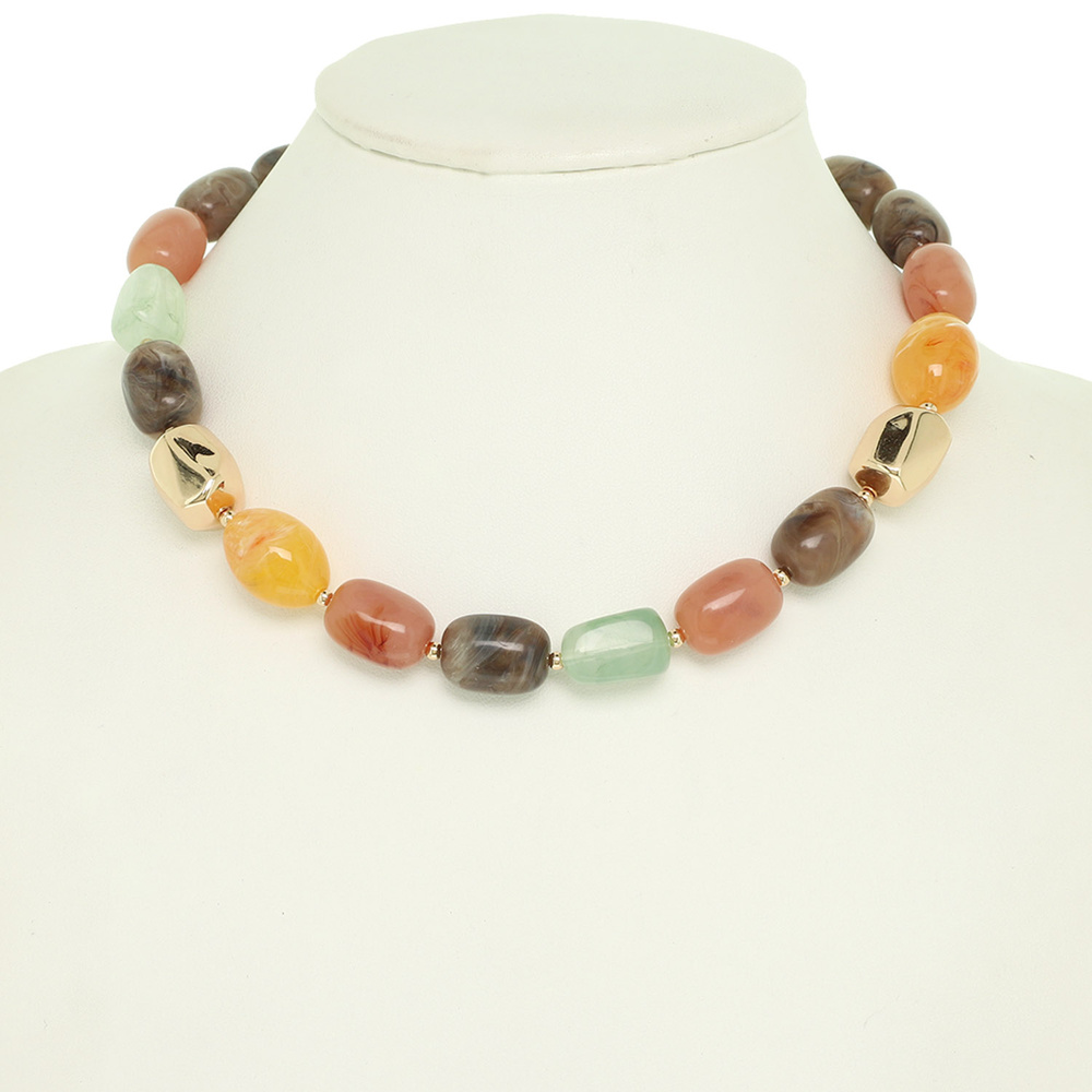 MUTLI COLOR STONE BEAD NECKLACE WITH MIXED SHAPES AND POLISHED GOLD TONE HARDWARE