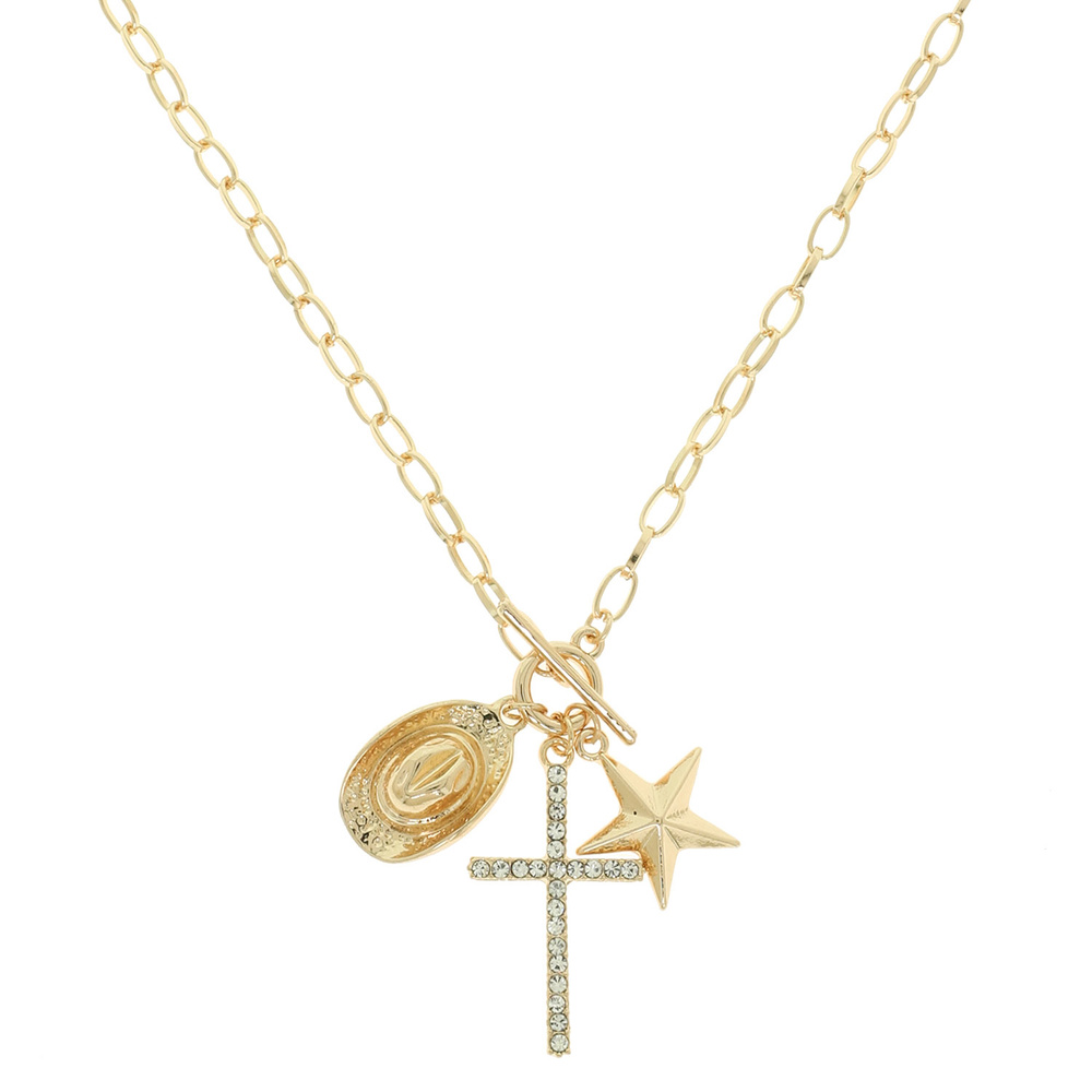 WESTERN STAR CROSS AND MEDALLION CHARM NECKLACE WITH TOGGLE CLASP WITH CRYSTAL ACCENTS