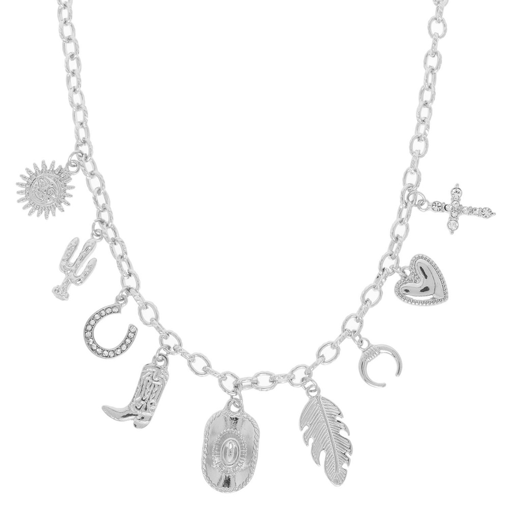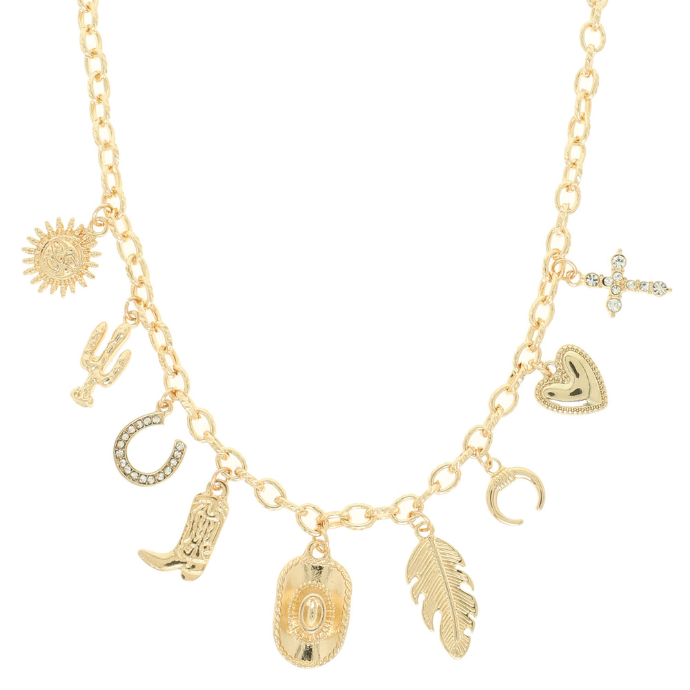 WESTERN MULTI CHARM NECKLACE WITH CACTUS BOOT FEATHER HEART HAT AND RHINESTONE ACCENTS