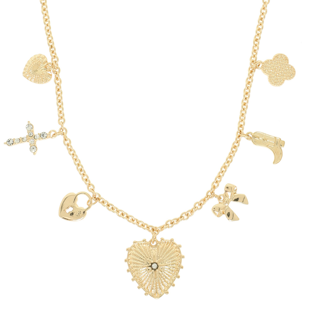 SUNBURST HEART MULTI CHARM NECKLACE WITH HEART FLOWER BOOT BOW CROSS AND CLOVER TRINKETS