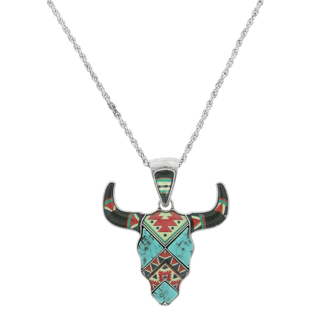 WESTERN TURQUOISE STEER HEAD PENDANT NECKLACE WITH AZTEK PRINT DETAILING