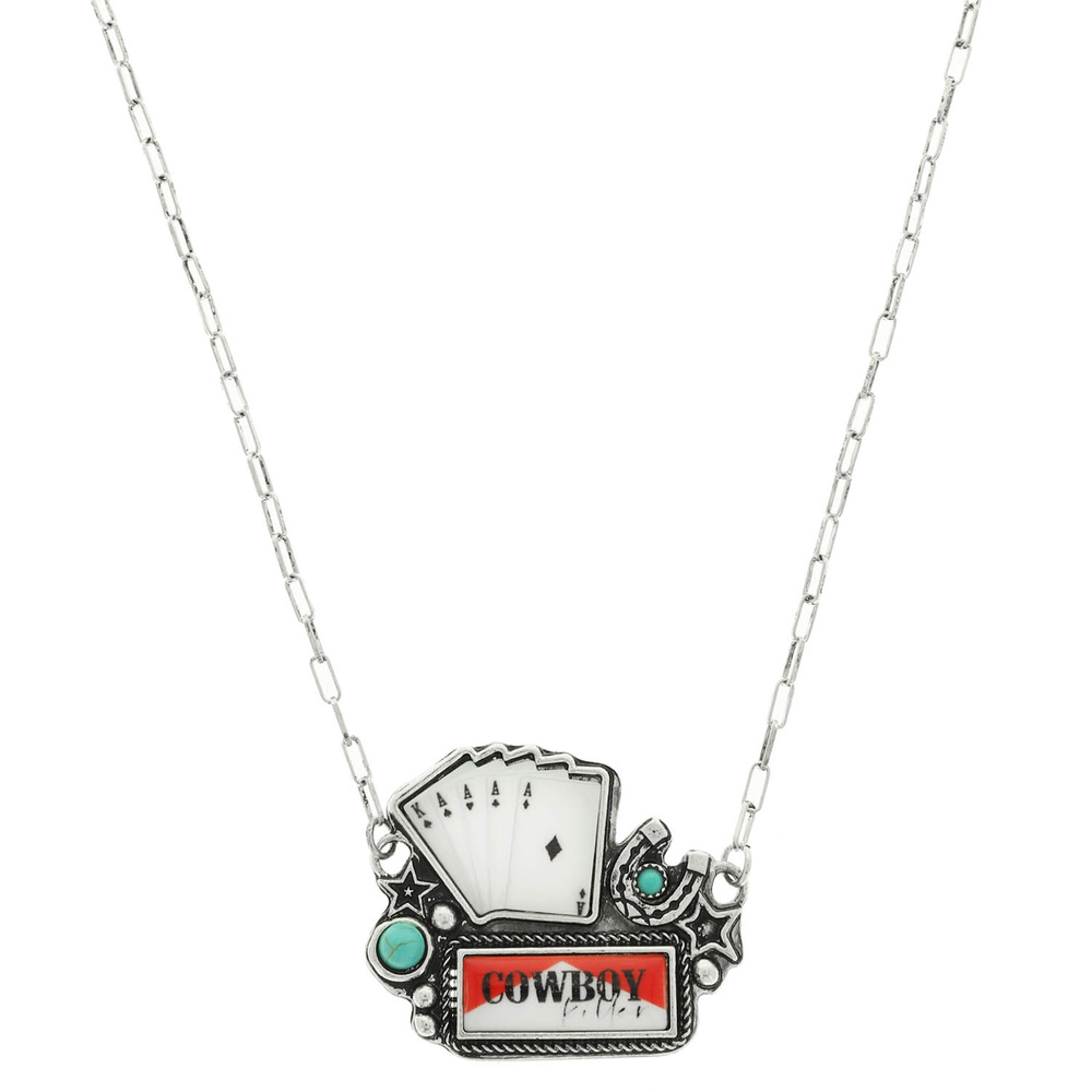 WESTERN PLAYING CARD COWBOY KILLER PENDANT NECKLACE WITH TURQUOISE ACCENTS
