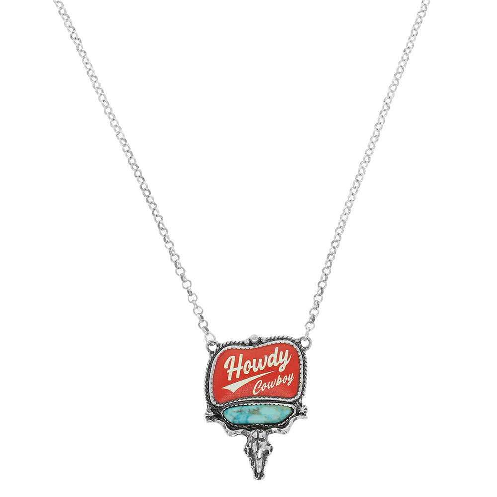 WESTERN HOWDY COWBOY PENDANT NECKLACE WITH TURQUOISE ACCENT AND LONGHORN SKULL