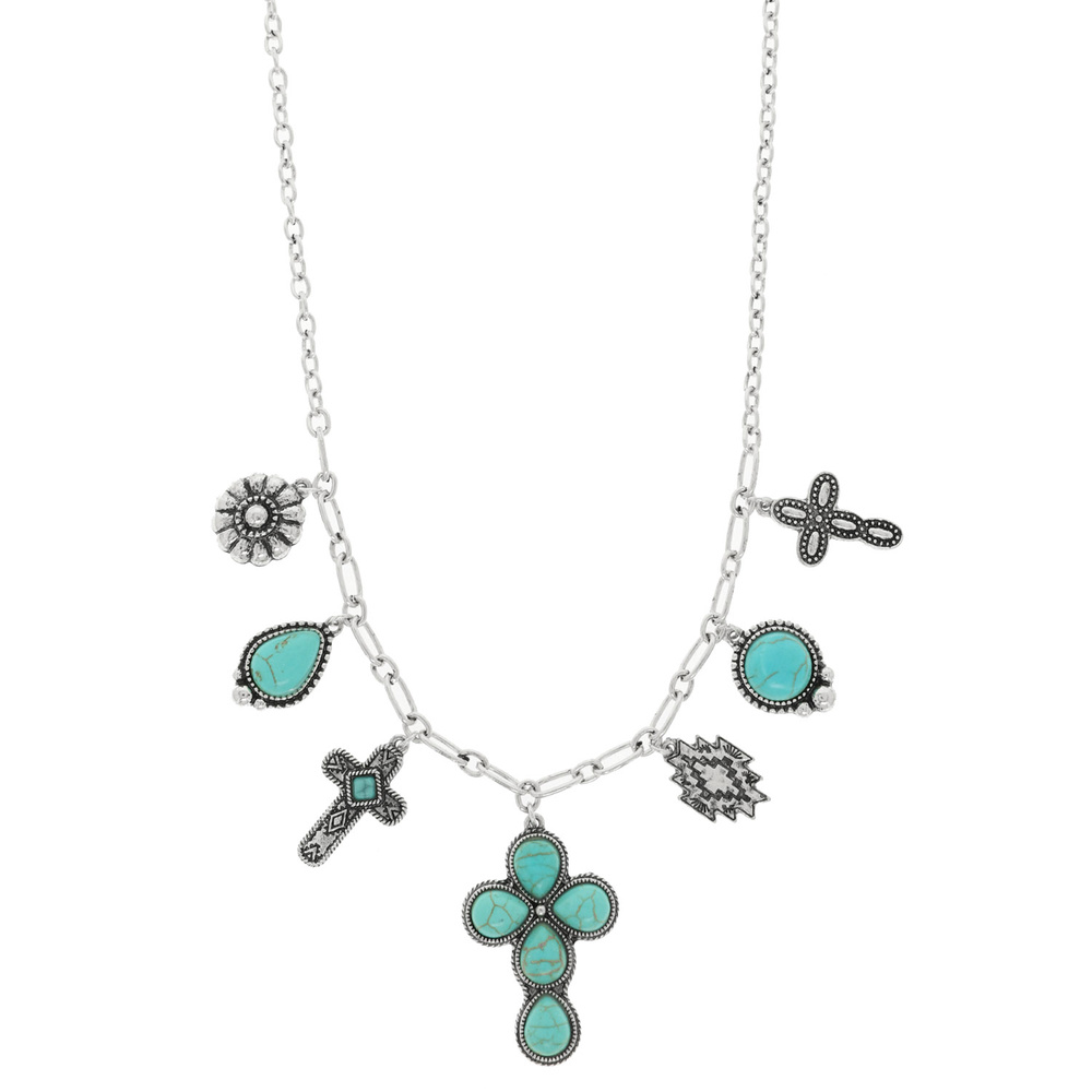 WESTERN TURQUOISE CROSS CHARM NECKLACE WITH FLOWER AND WESTERN TRINKETS