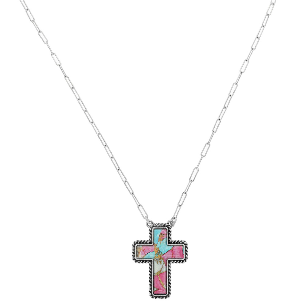 WESTERN MARBLED TURQUOISE CROSS PENDANT NECKLACE
