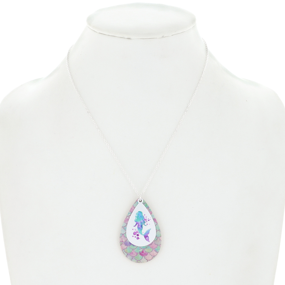 MERMAID-NAUTICAL SEA LIFE PRINT WOODEN TEARDROP PENDANT NECKLACE W/ ADJUSTABLE CHAIN