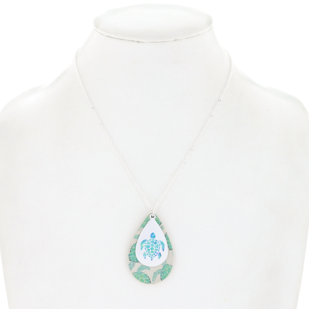 SEA TURTLE-NAUTICAL SEA LIFE PRINT WOODEN TEARDROP PENDANT NECKLACE W/ ADJUSTABLE CHAIN