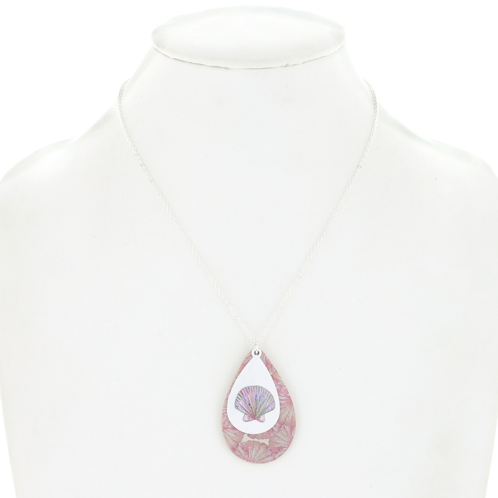 SEASHELL-NAUTICAL SEA LIFE PRINT WOODEN TEARDROP PENDANT NECKLACE W/ ADJUSTABLE CHAIN