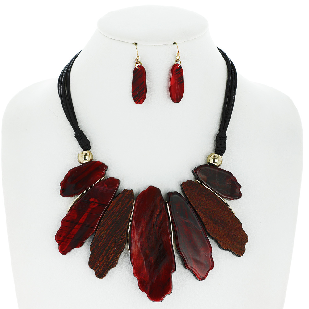 Bohemian Stone And Wood Adjustable Bib Leather Cord Necklace Earring Set