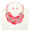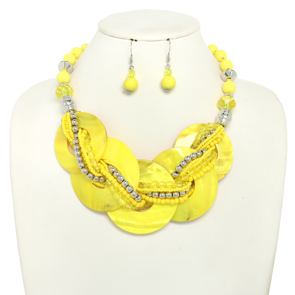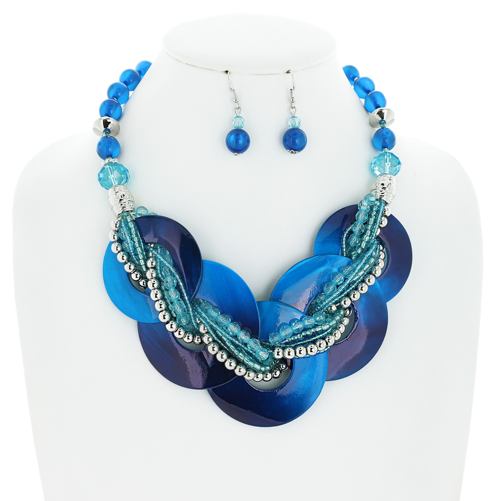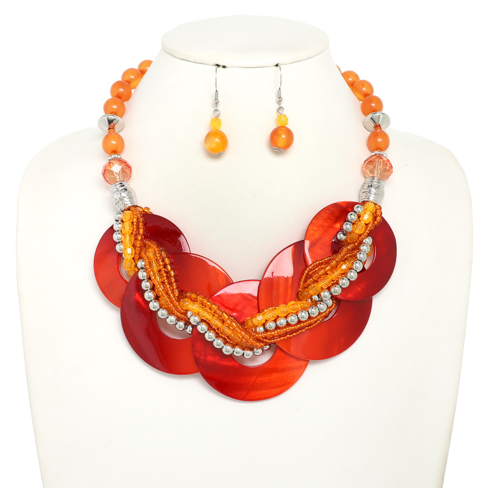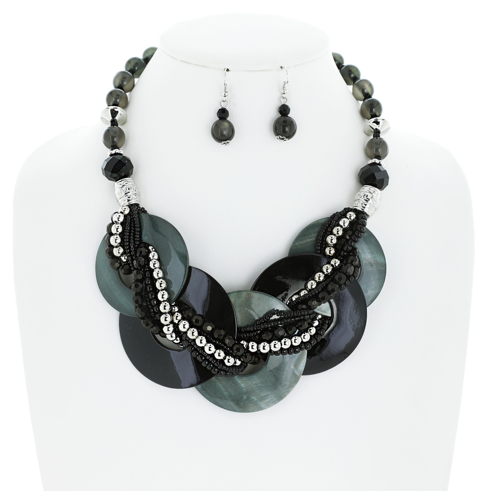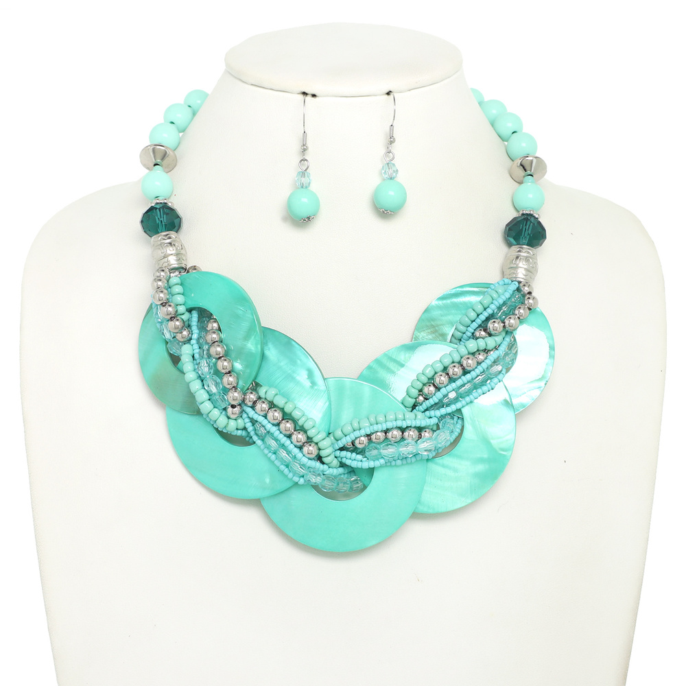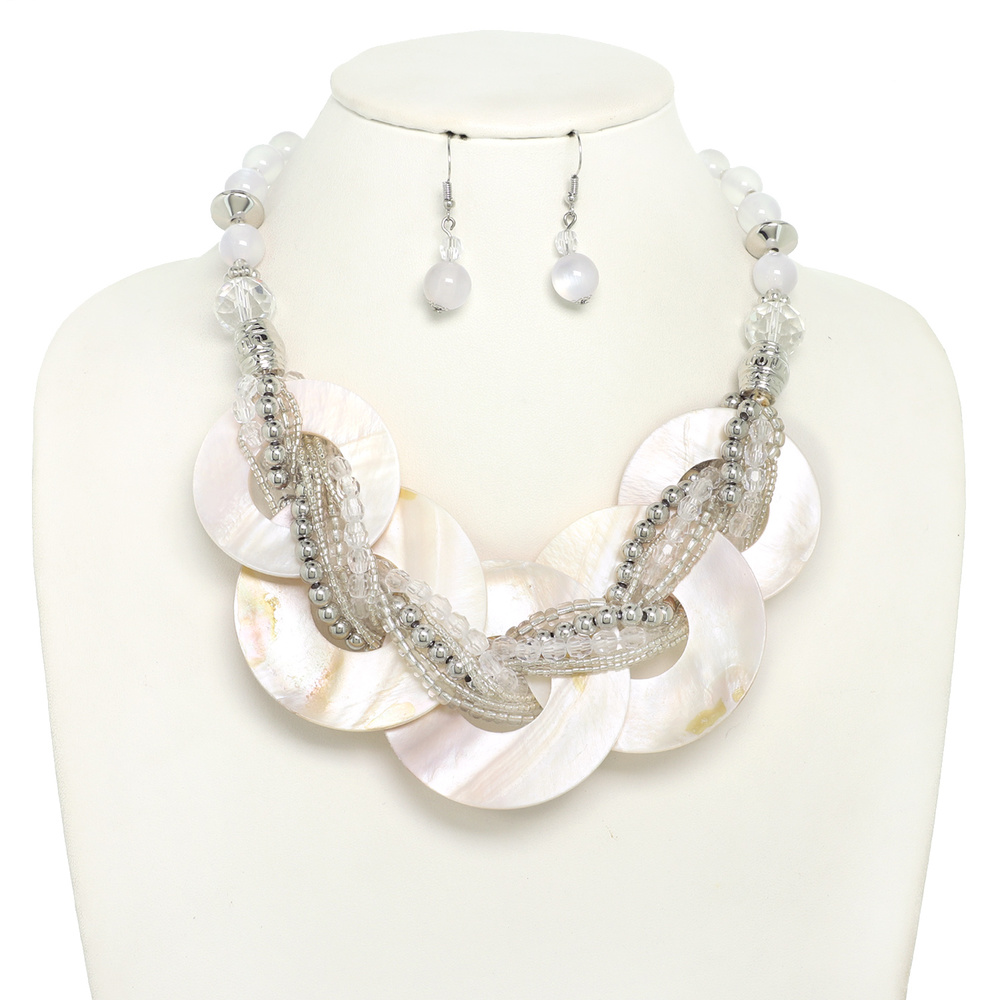 MOTHER OF PEARL OVAL DISC BRAIDED BEAD NECKLACE PEARL EARRING SET