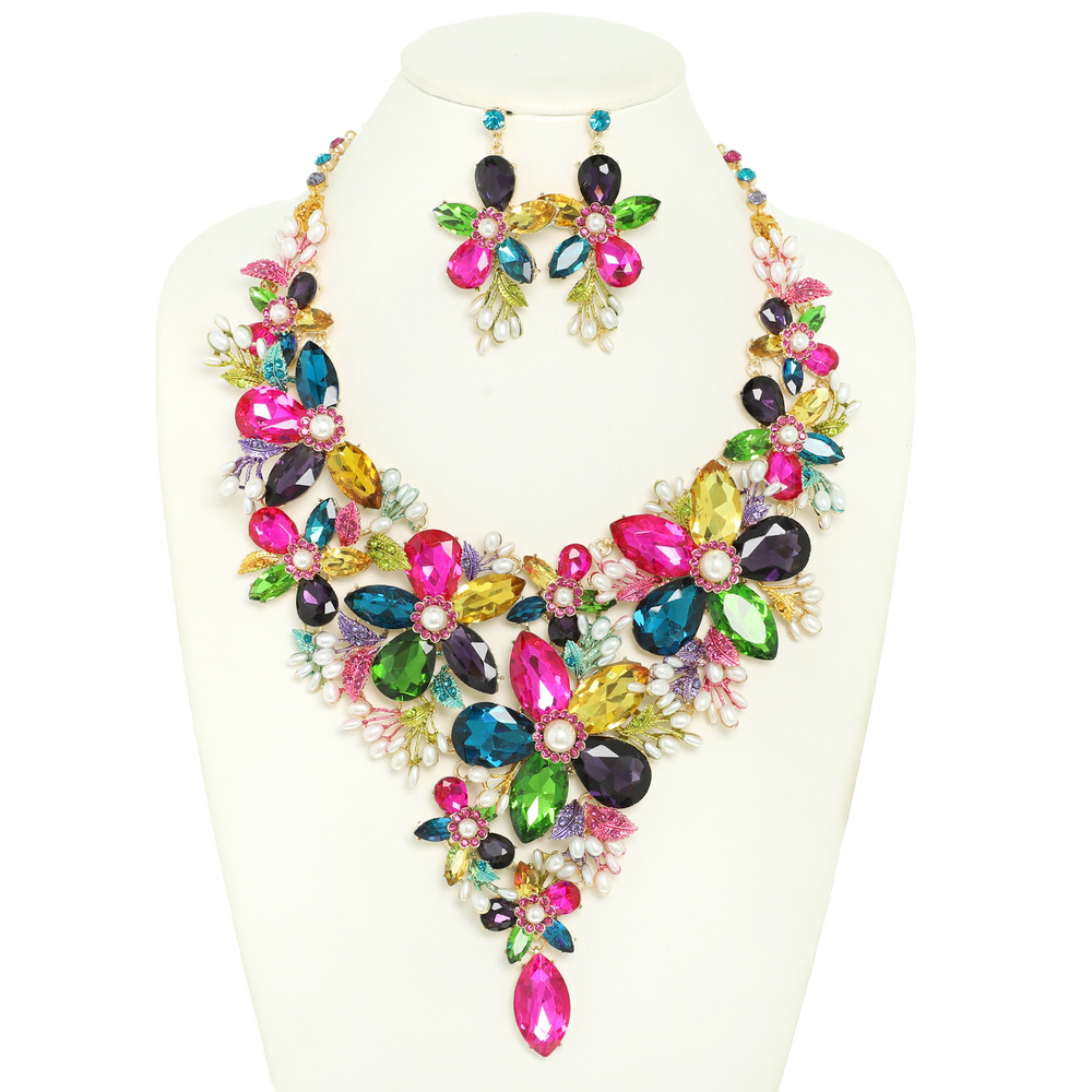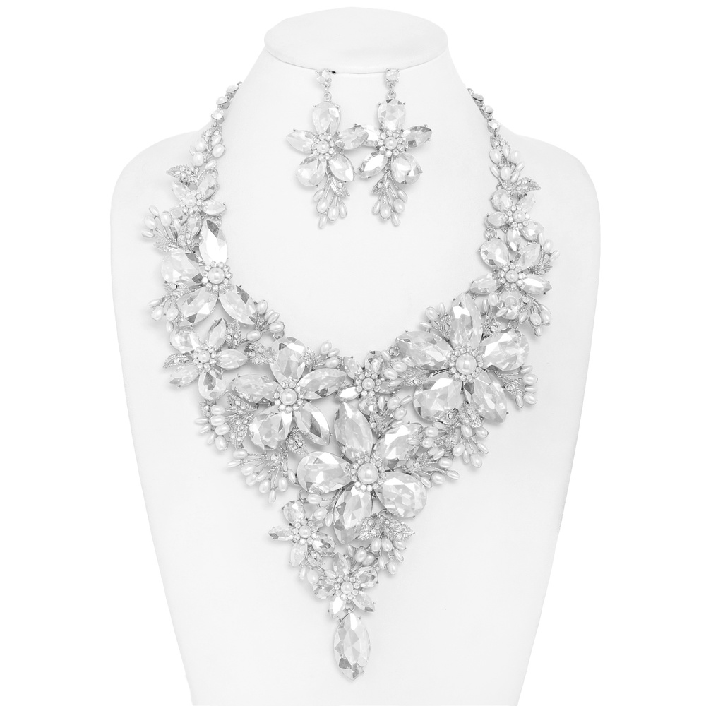 FLORAL RHINESTONE CRYSTAL PEARL STATEMENT BIB NECKLACE EARRING SET