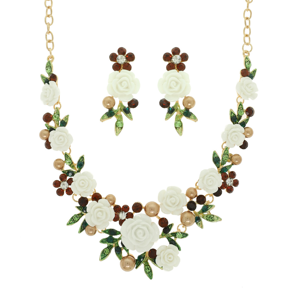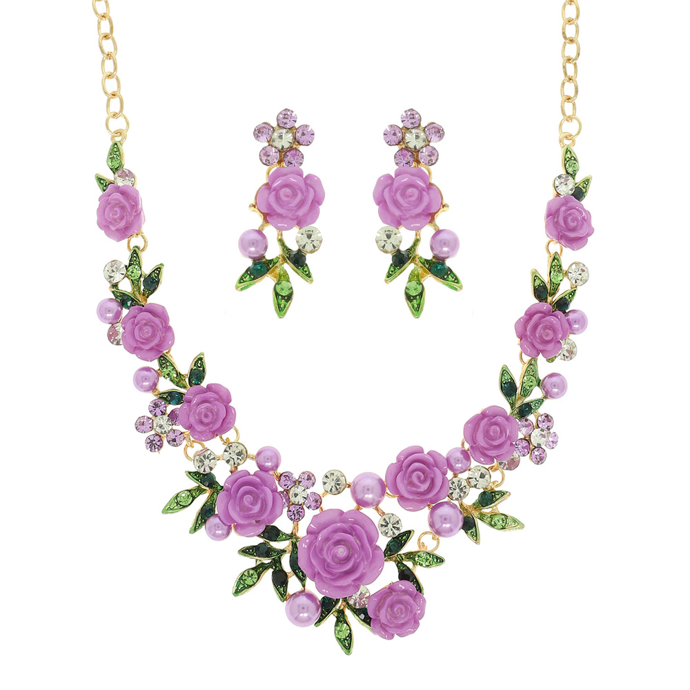 FESTOON NECKLACE EARRING SET WITH ENAMEL ROSE RHINESTONES AND PEARL BEAD EMBELLISHMENTS