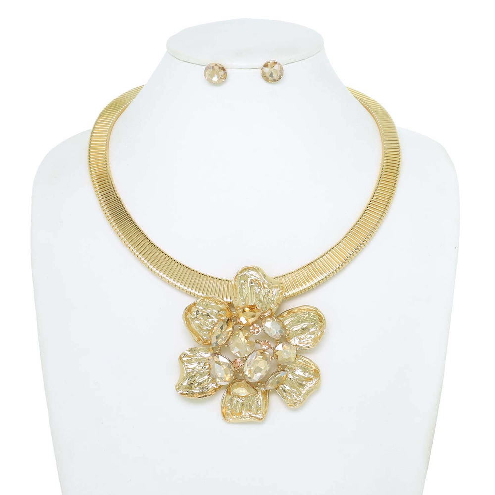 GEMSTONE EMBELLISHED FLORAL HAMMERED METAL ADJUSTABLE SNAKE CHAIN COLLAR NECKLACE EARRING SET