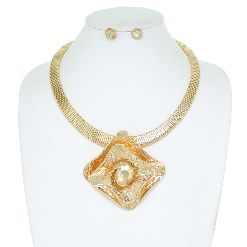 GEMSTONE EMBELLISHED DIAMOND SHAPED HAMMERED METAL ADJUSTABLE SNAKE CHAIN COLLAR NECKLACE EARRING SET