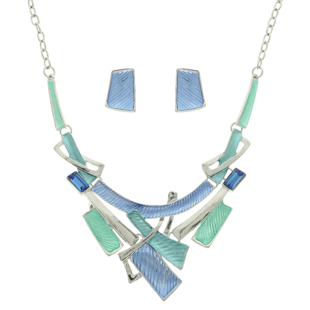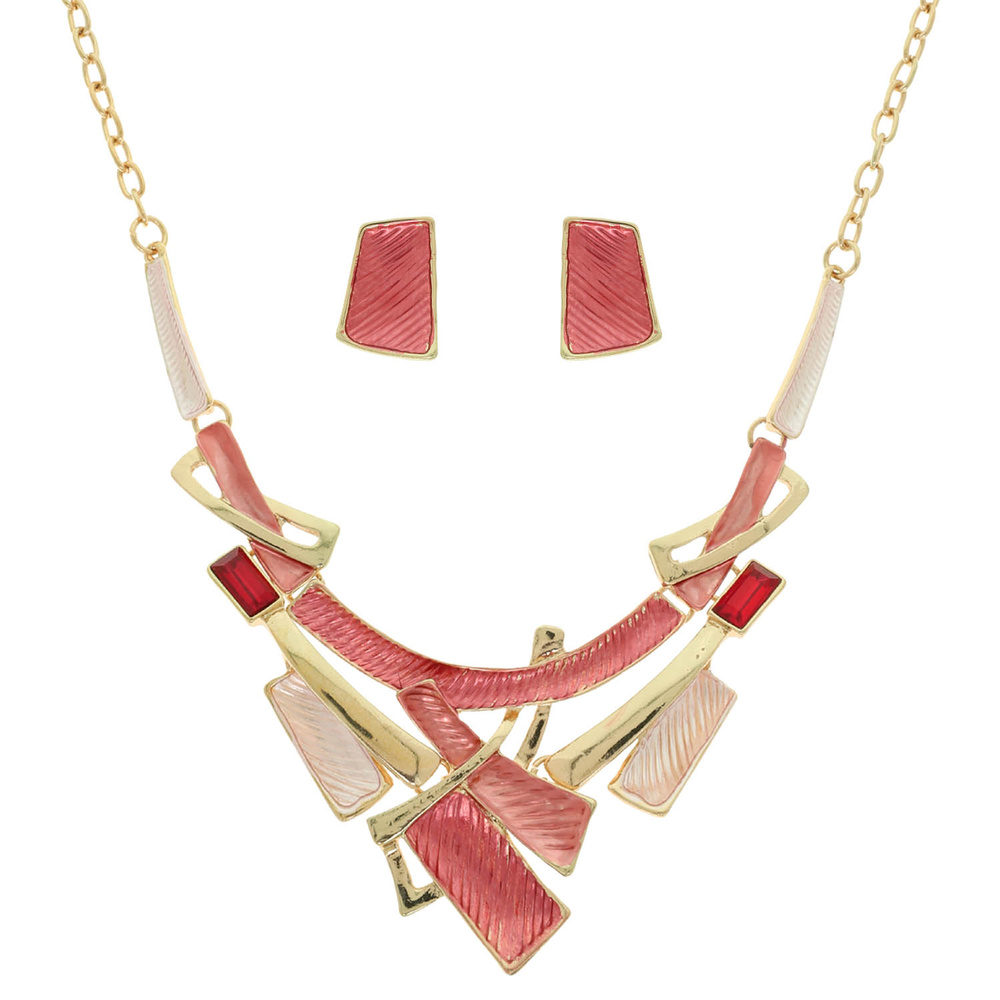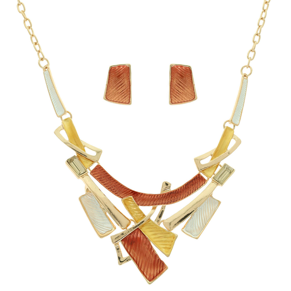 MULTICOLOR GEOMETRIC TEXTURE BAR DESIGN NECKLACE EARRING SET WITH CRYSTAL ACCENTS