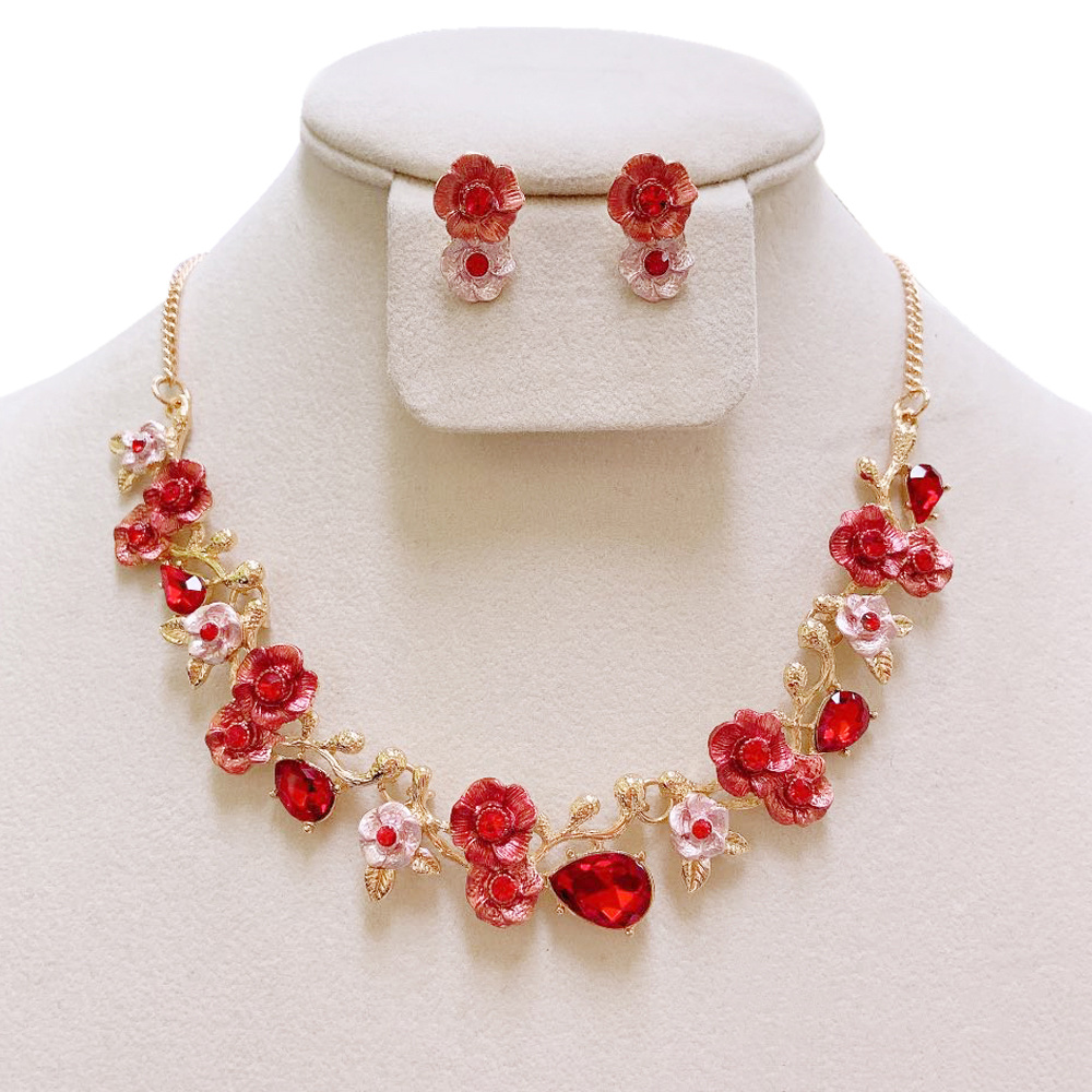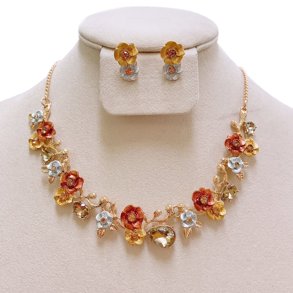 METALSMITHED BEZEL-SET CRYSTAL ROSE NECKLACE EARRING SET