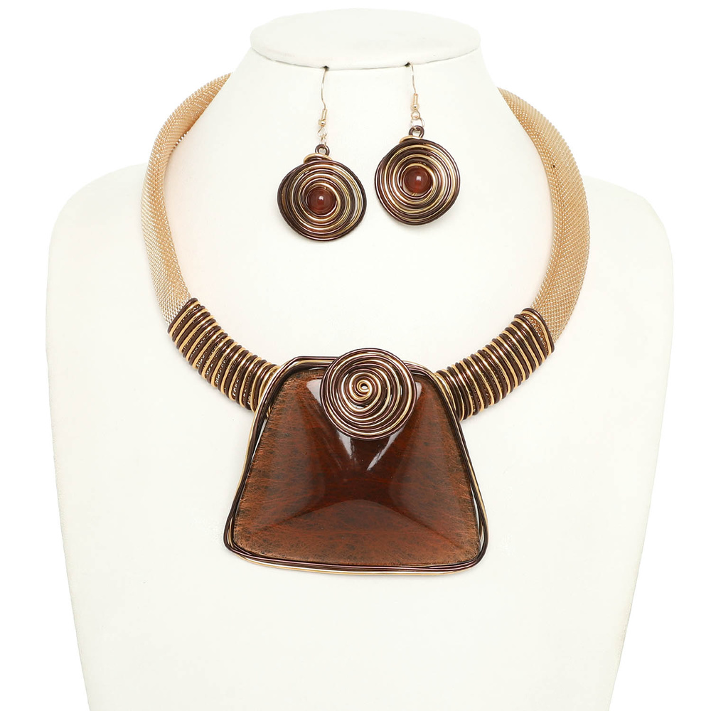 PECTORAL STYLED RESIN STONE AMULET NECKLACE AND EARRING SET