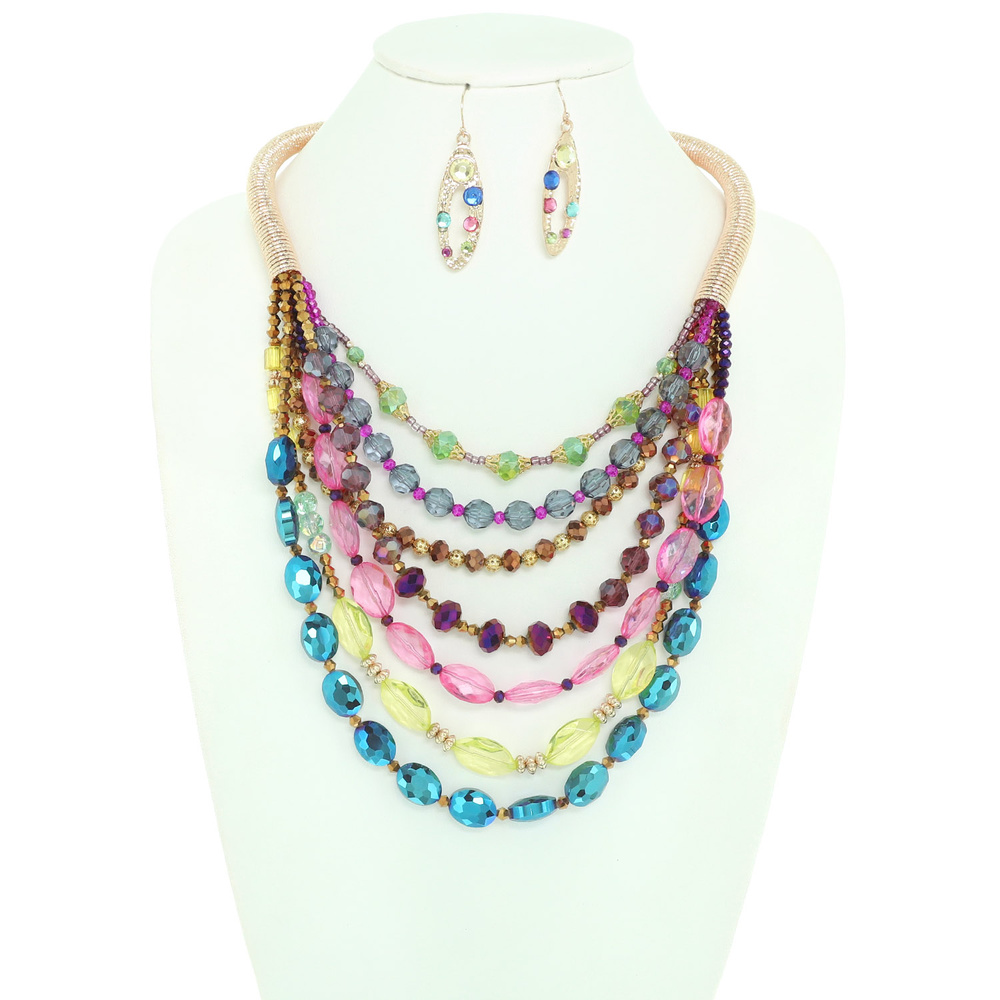 MULTICOLOR MULTI LAYERED CRYSTAL BEAD NECKLACE EARRING SET