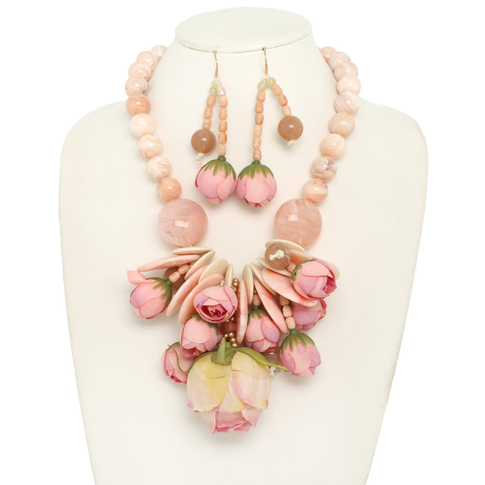 ACRYLIC AND MARBLED BEAD FABRIC FLOWER NECKLACE EARRING SET