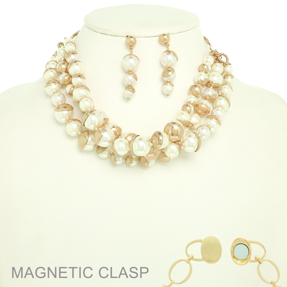 PEARL BEAD NECKLACE EARRING SET WITH GOLD TONE METAL
