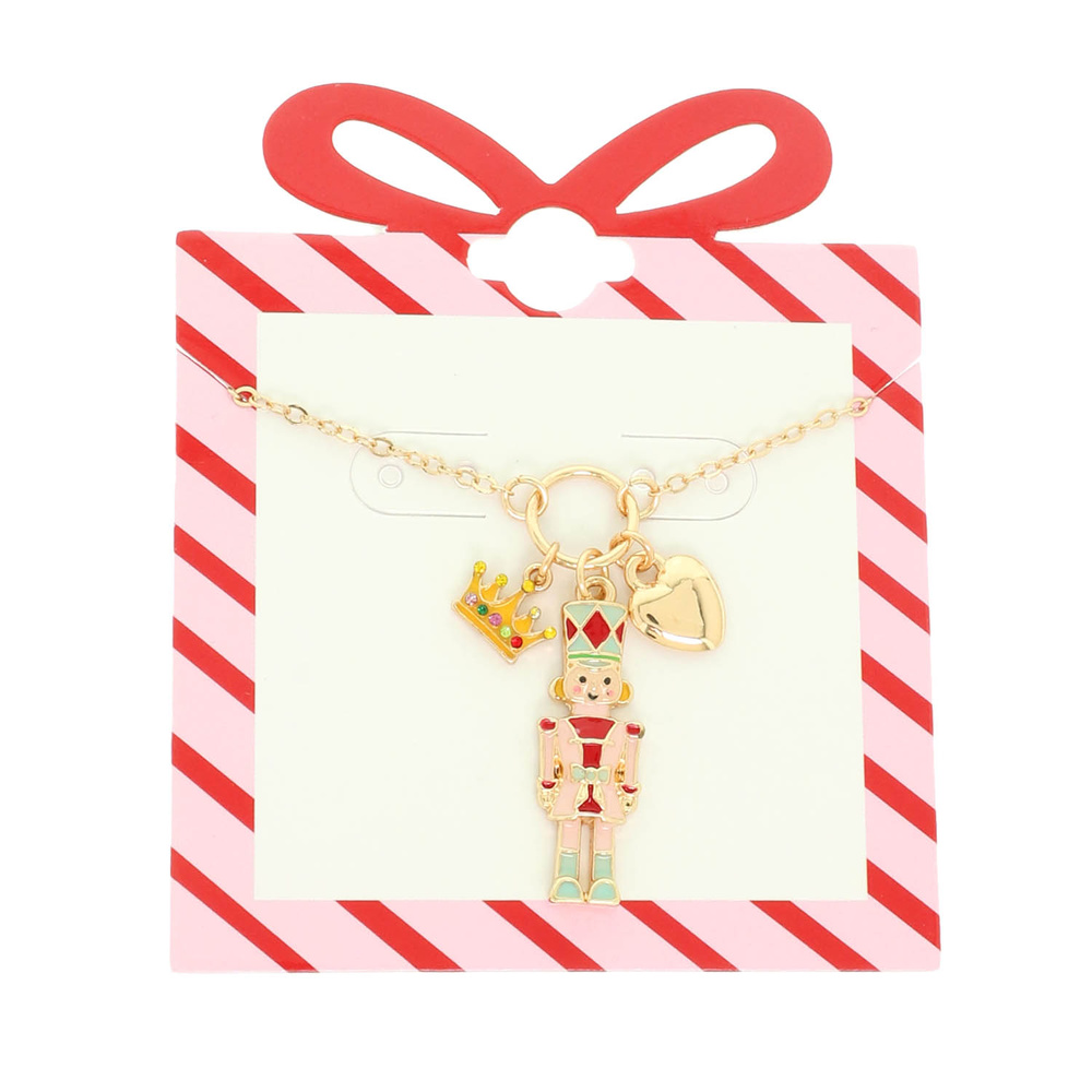 CHRISTMAS ENAMEL NUTCRACKER CHARM NECKLACE WITH CRYSTAL EMBELLISHED CROWN AND HEART TRINKETS