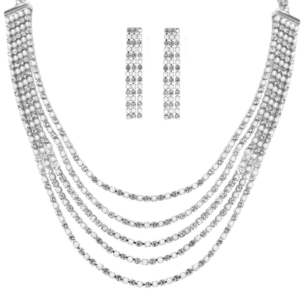5-ROW CRYSTAL RHINESTONE AND PEARL ADJUSTABLE MULTISTRAND NECKLACE EARRING SET