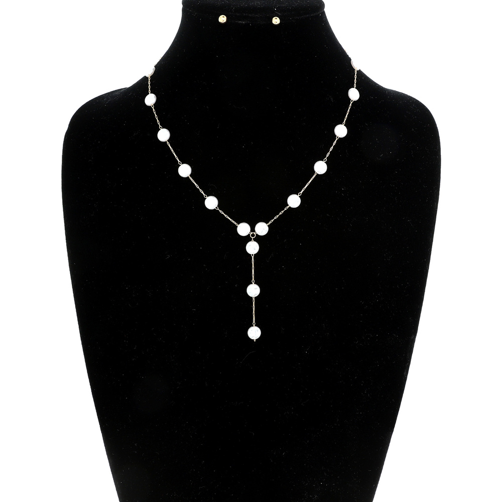 16" ADJUSTABLE LARIAT PEARL STATION CHAIN NECKLACE AND STUD EARRING SET IN GOLD TONE METAL