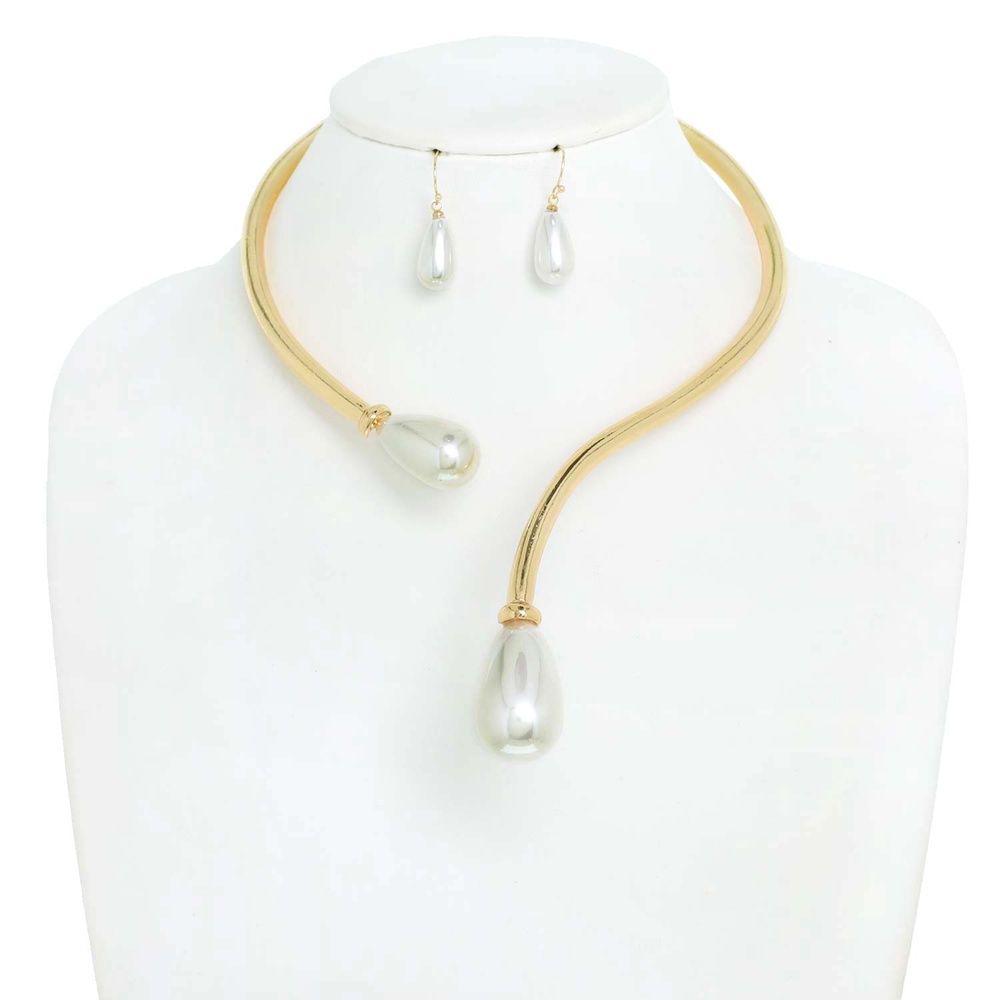 17"DOUBLE TEARDROP PEARL METAL COLLAR HINGE NECKLACE EARRING SET
