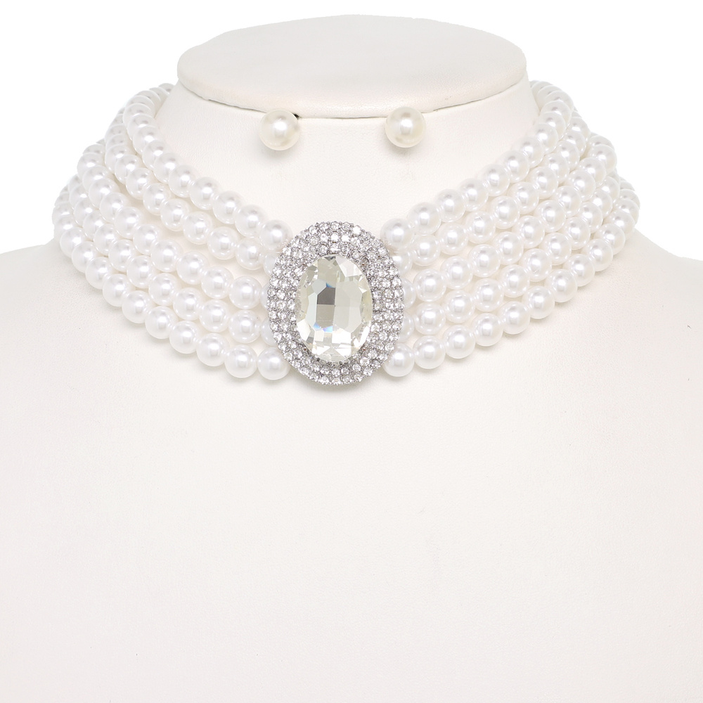 MULTILAYER PEARL CHOKER WITH RHINESTONE PAVE CRYSTAL CENTER PENDANT EARRING SET