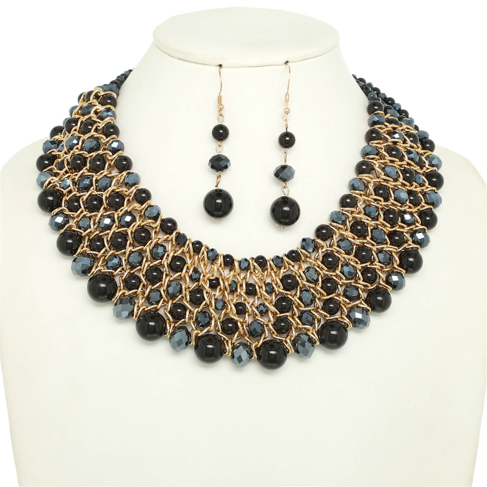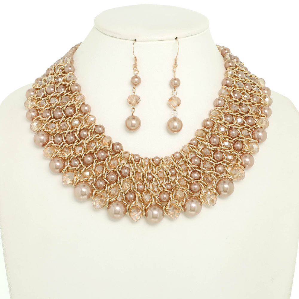 MULTI STRAND PEARL FACET BEAD AND CHAIN NECKLACE EARRING SET