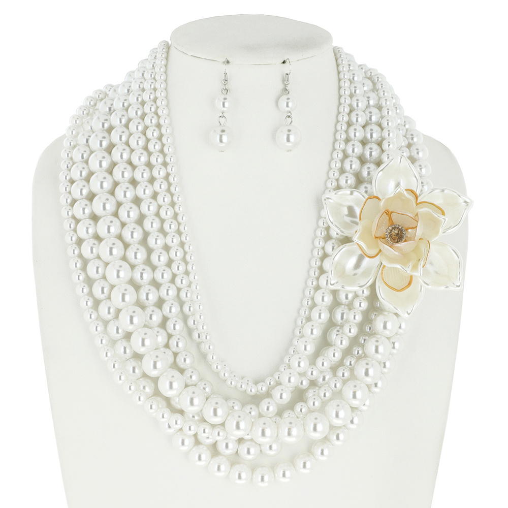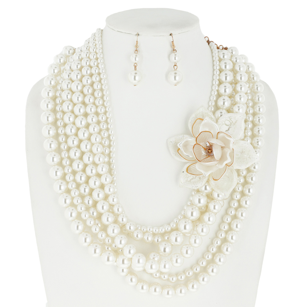 7 LINE PEARL NECKLACE SET W/ LG FLOWER